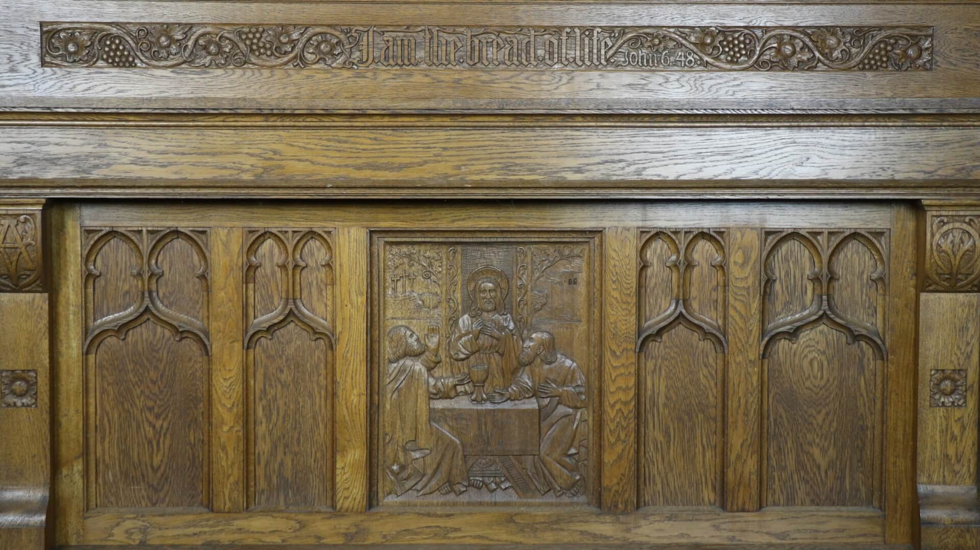 The altar was hand carved by Jes Smidt, a Danish immigrant from Southern Jutland. The altar was used in Immanuel Lutheran Church in Minneapolis, Minnesota. Jes Smidt hand carved the intricate piece at the age of 80.