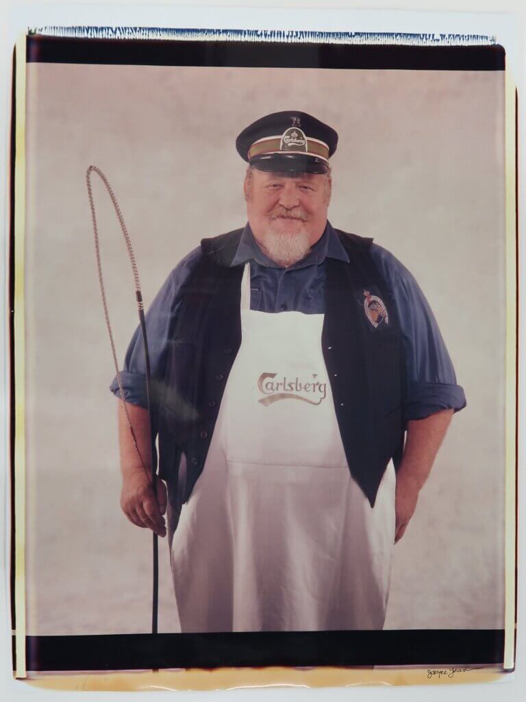 This large-scale Polaroid depicts a Carlsberg coachman. Before 1950, he would have steered a horse-drawn carriage and delivered beer to shops or pubs. Now the coachmen are used at special events to keep the tradition alive. This piece was taken by the photographer Joyce Tenneson in 1990 as part of a series of portraits of different Danish citizens.