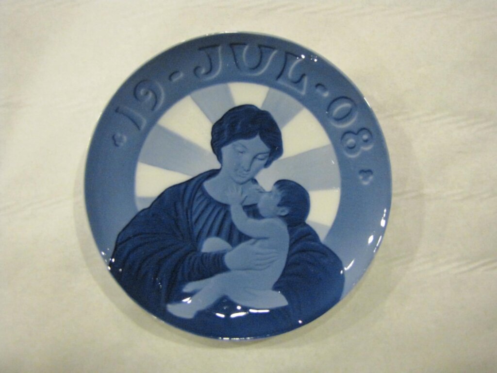 Royal Copenhagen started producing their own Christmas Plates in 1908. The first one, designed by Christian Thomsen, uses the Virgin Mary with child as motif. The first plate reads in Danish “Christmas 1908”