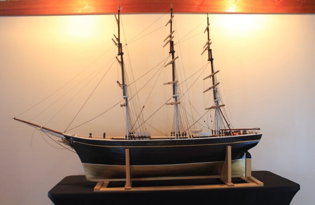 John Curtin built this model of the Danish warship Jylland from scratch using plank-on-frame construction for the hull. In order to preserve the accuracy of the model, the rigging was hand-tied. This is no easy task – it took three years to complete this model, two of which were dedicated to preparing and tying the rigging. Curtin decorated the ship with cargo and stern paintings that closely match the real ship.