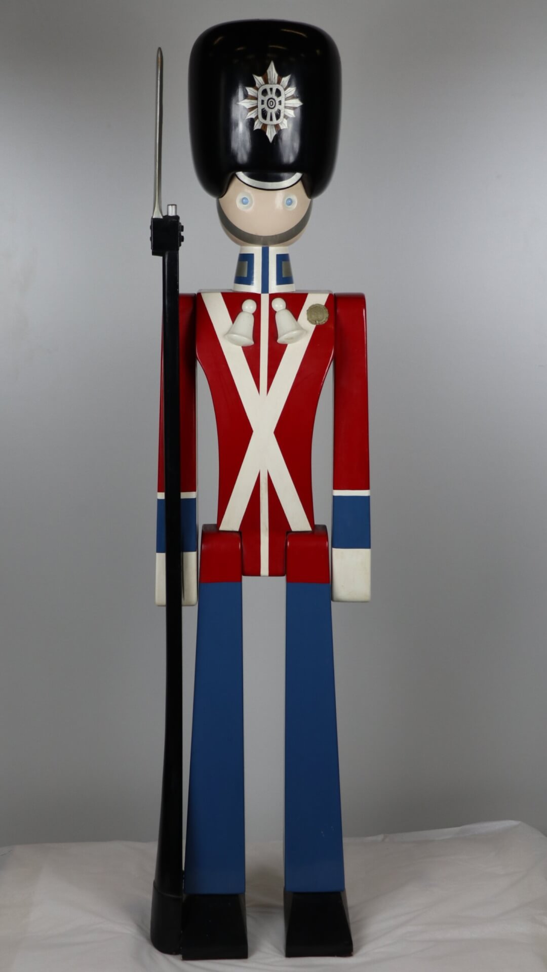 This Guardsman is a gigantic copy of designer Kay Bojesen’s Danish Royal Guard figures. The original, 39” version, which represents the soldiers who protect the royal family, was created in 1940 for King Christian X’s 70th birthday. Production of the 10” toy Guardsman started in 1942. This guardsman, however, stands at a massive 63” tall!