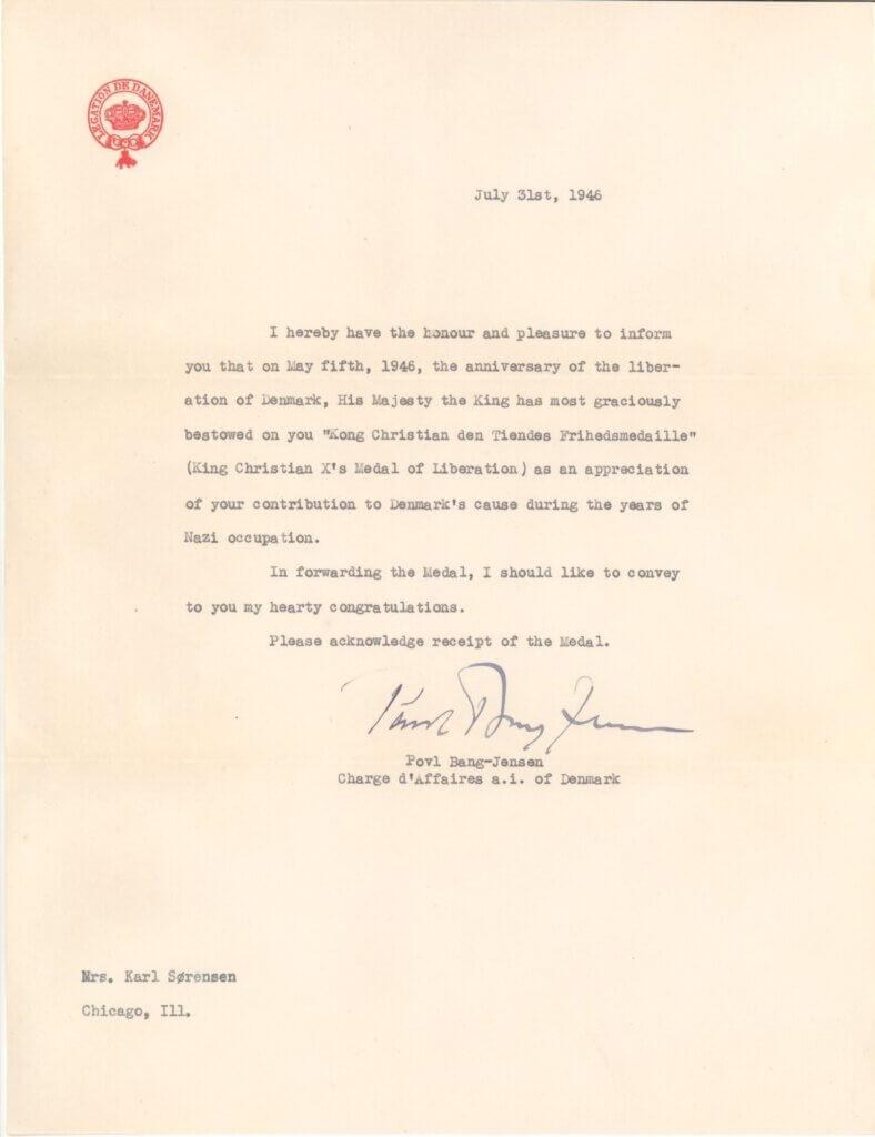 This letter accompanied the Medal of Liberation. It states that the king was appreciative of Jenny Sørensen’s contribution to Denmark’s cause during the years of Nazi occupation.