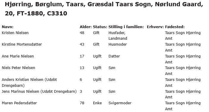 Household listing from the 1880 Denmark census in Taars parish, Hjørring county, obtained from Dansk Demografisk Database. Anders Kristian Nielsen is the author’s great grandfather.